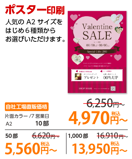 | A1 | 片面カラー | 光沢紙 | 1部 | 2,020 円 | 10部 | 10,770 円 |