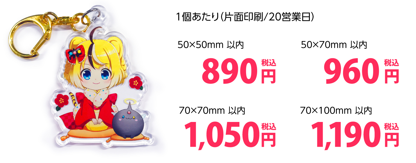 プリントパックのアクリルキーホルダー印刷は、最少1個~890円からご注文可能で