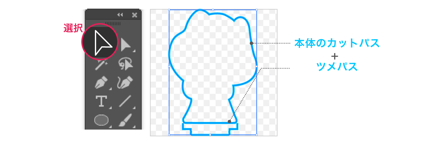 2. 本体のカットパスと、テンプレート内の台座に差し込むツメパスを合体します。