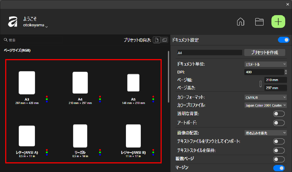 ドキュメント設定のプリセットを作成しておくとで次回以降の作成がスムーズになります。