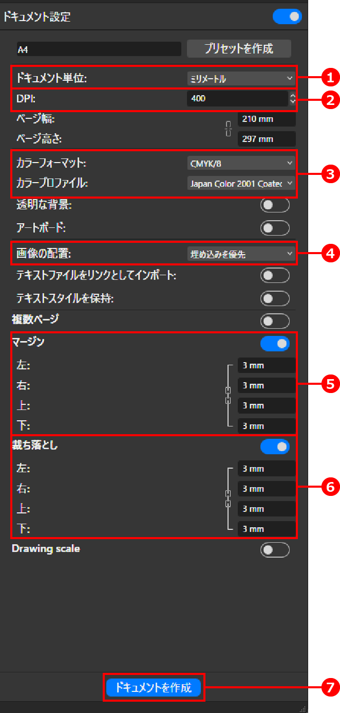 【3】画面右側の【ドキュメント設定】を下記に設定(RGBとCMYKで設定が異なります)