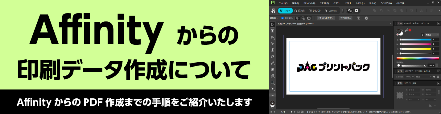 Affinity の独自形式(.afdesign、.afphoto、.afpubなど)での入稿には対応しておりません。必ず 「PDF/X-4形式」で書き出したデータをご入稿ください。 ⇒ PDF形式の書き出し方法はこちら |