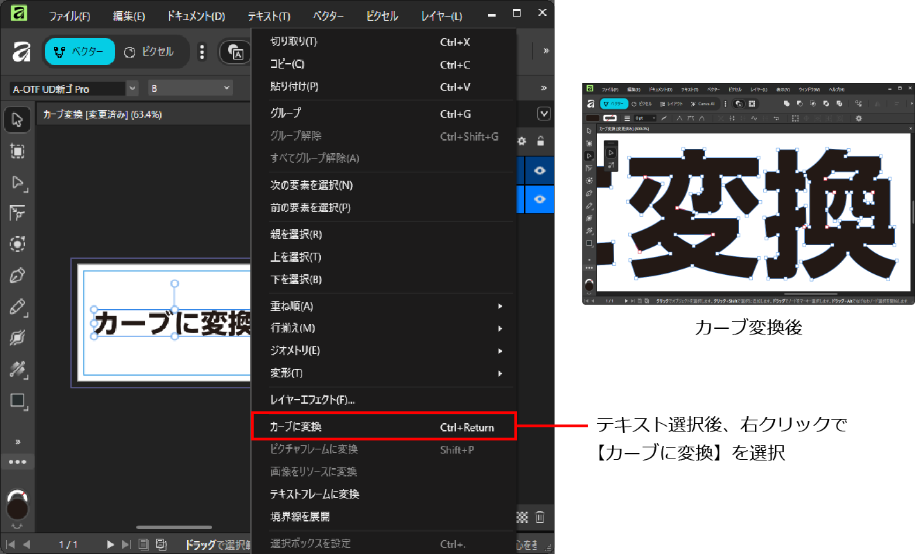 Affinity ソフトでは、テキストを【カーブ変換】することで文字の崩れを防ぐことができます。