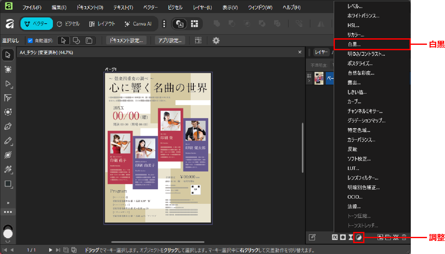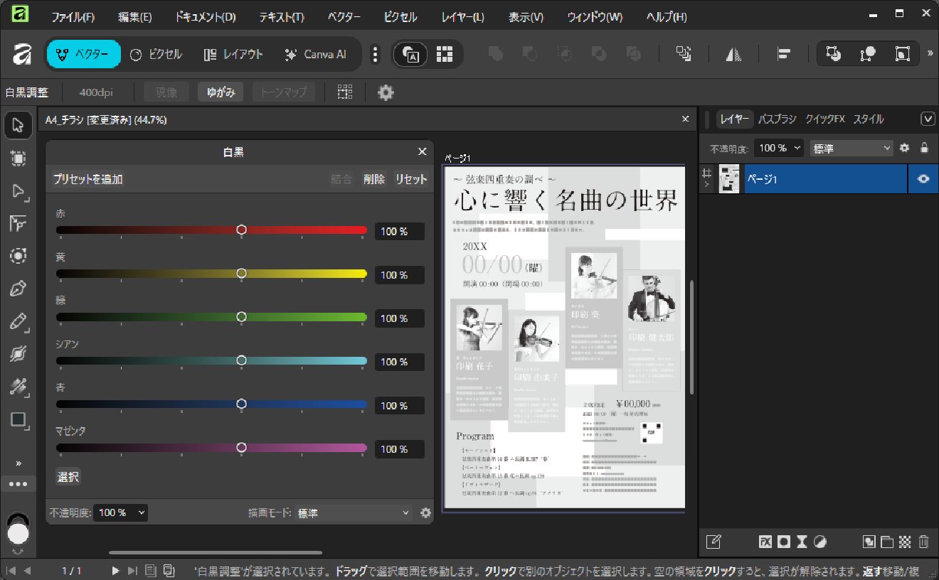 すでに作成されたデザインを一括でグレースケールに変換する方法もございます。