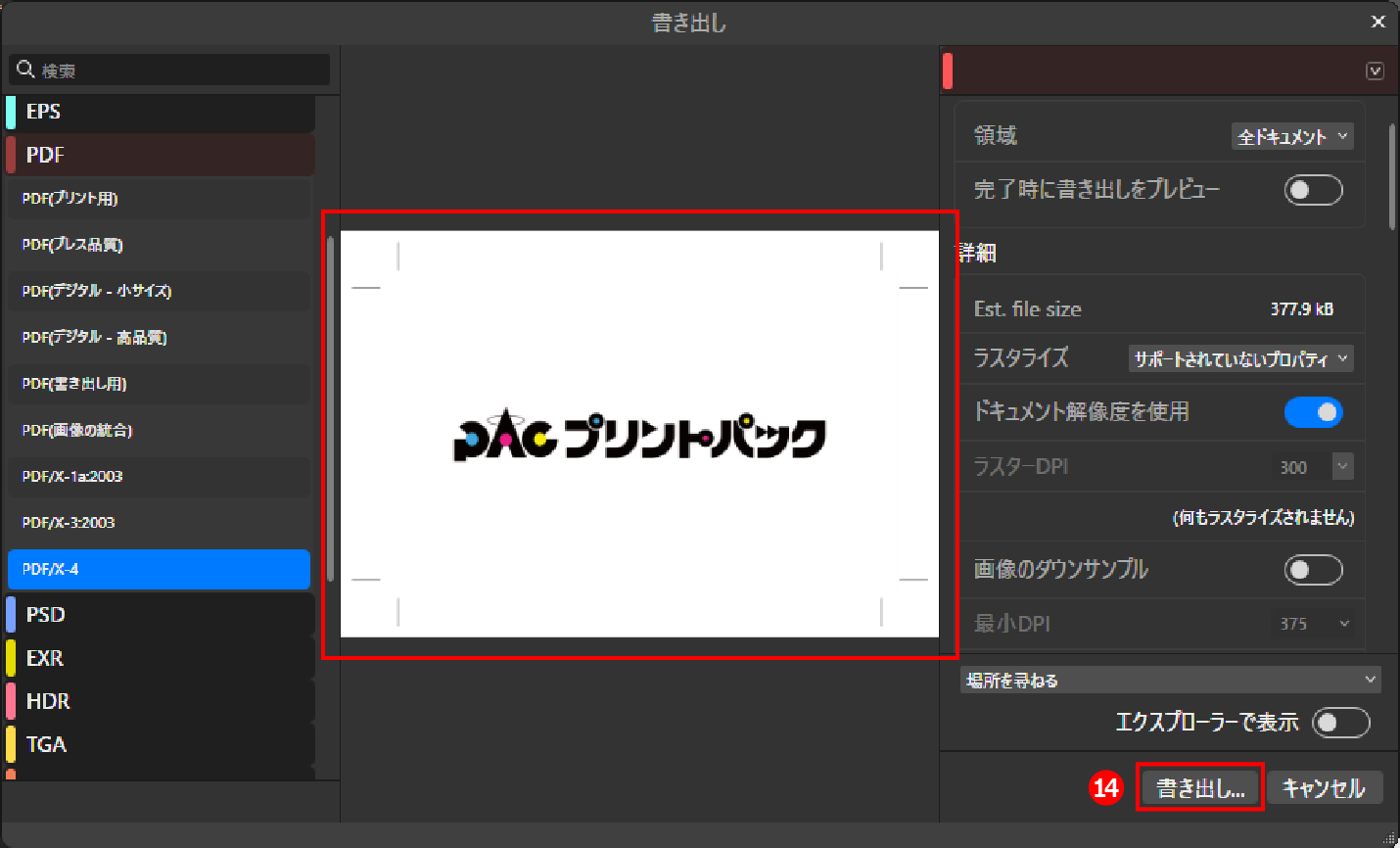 【2】画面左側のファイル形式一覧から【PDF】 ⇒ 【PDF/X-4】を選択