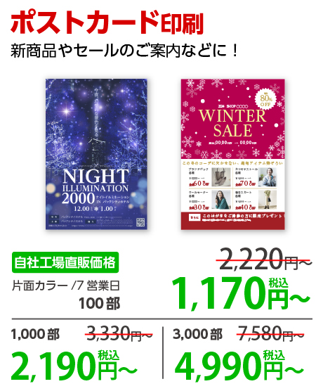 | はがきサイズ | ホワイトアートポスト180 | 両面カラー | 10部 | 1,330 円 | 30部 | 1,420 円 |