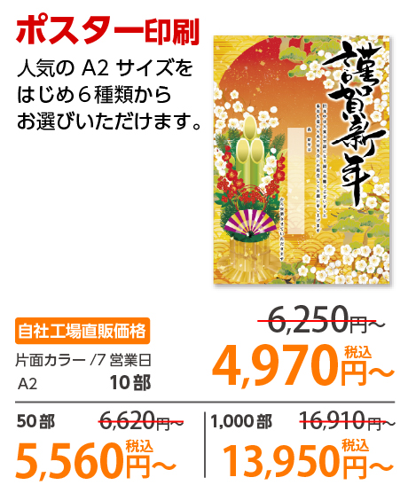 | A2 | 片面カラー | 光沢紙 | 1部 | 1,270 円 | 10部 | 7,160 円 |