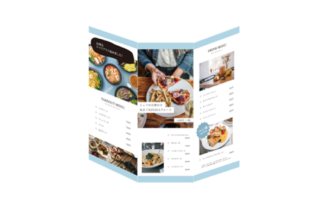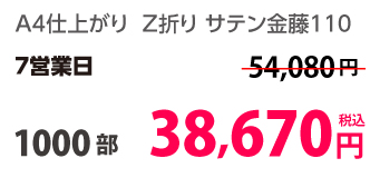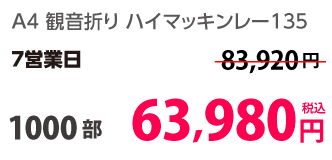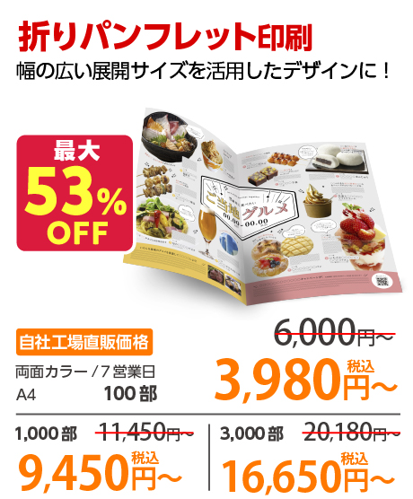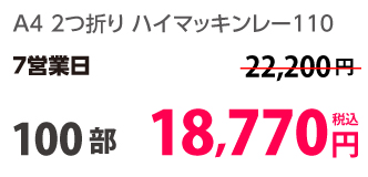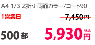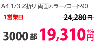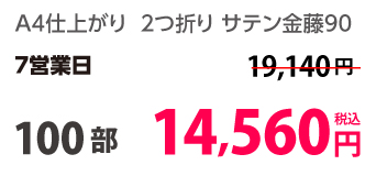 | A4 仕上がり | 二つ折り | 両面カラー | コート90 | 100部 | 3,980 円 | 1000部 | 9,450 円 |