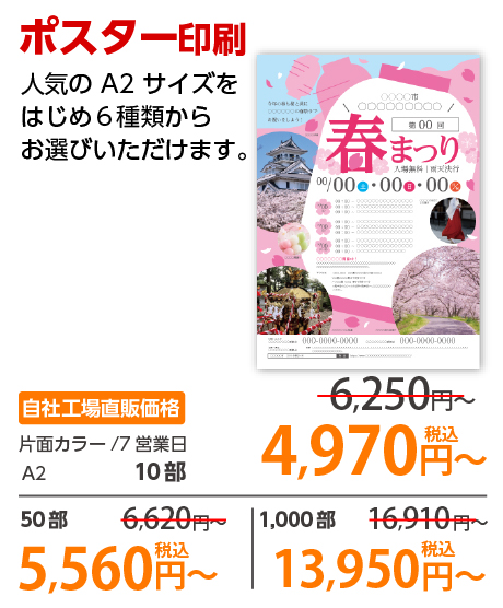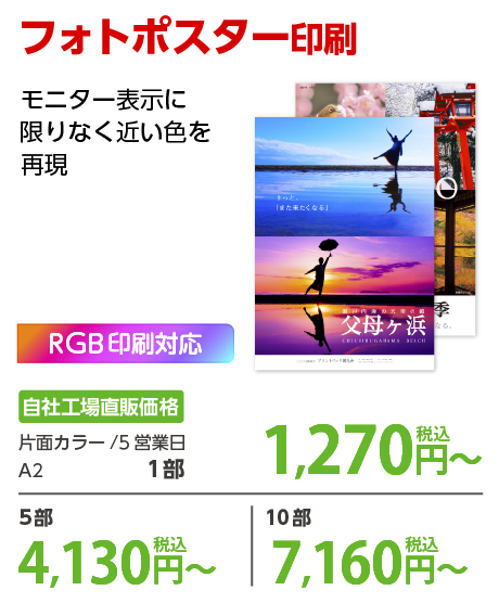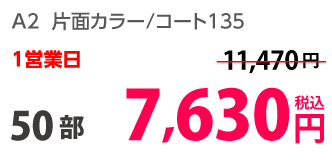| A2 | 片面カラー | 光沢紙 | 1部 | 1,270 円 | 10部 | 7,160 円 |