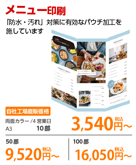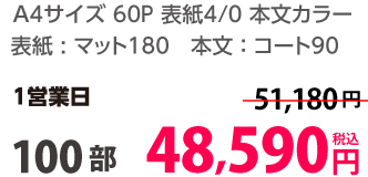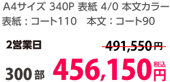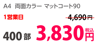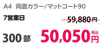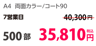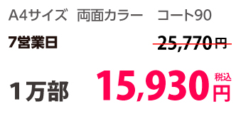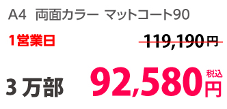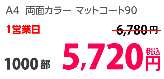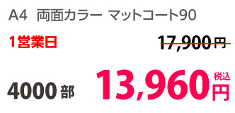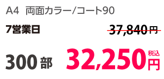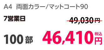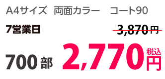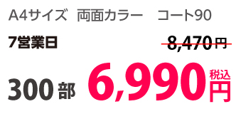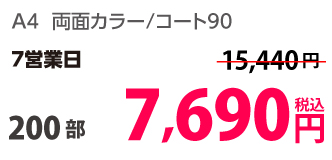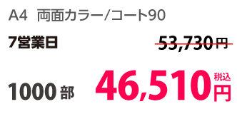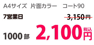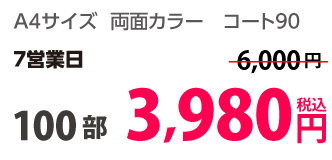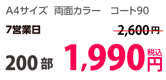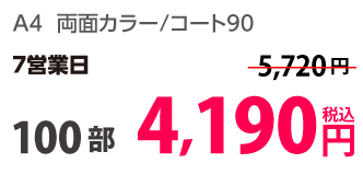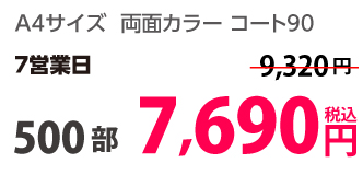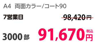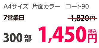 | A4 | コート90kg | 両面カラー | 100部 | 1,820 円 | 1000部 | 2,910 円 |
