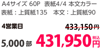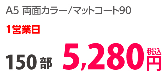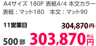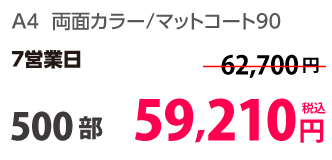 | A4 | 両面カラー | コート90/コート90 | 8P | 500部 | 13,610 円 | 5,000部 | 45,510 円 |