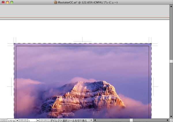 画像に塗り足しを作成する場合は、裁ち落とし(塗り足し)サイズの長方形オブジェクトを作成し、裁ち落としの位置に配置します。オブジェクトを画像の前面に配置して、オブジェクトメニューから[クリッピングマスク─作成]します。画像のクリッピングマスクは裁ち落とし位置でなくても、トリムマークからはみ出していなければOKです。 |