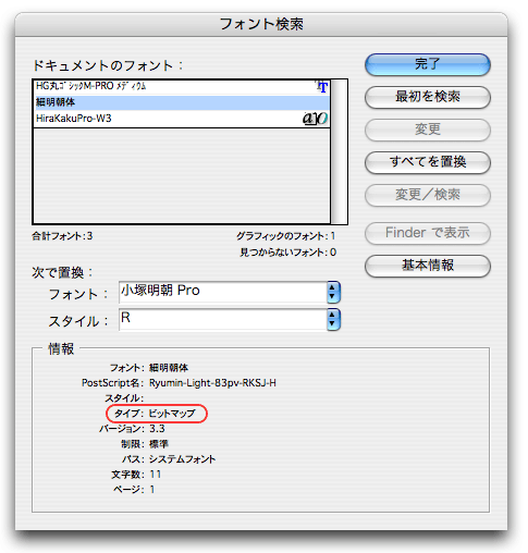ドキュメントで使用するフォントは、埋め込み可能なフォントのみを使用します。埋め込みできないフォントやビットマップフォントは使わないで下さい。埋め込みできないフォントやビットマップフォントは、書式メニューの[フォントの検索]で調べることができます。フォントを選択して[情報]にある[制限]で「埋め込みできません」と表記されているフォントや、[タイプ]に「ビットマップ」と表示されるフォントは使用しないで下さい。
