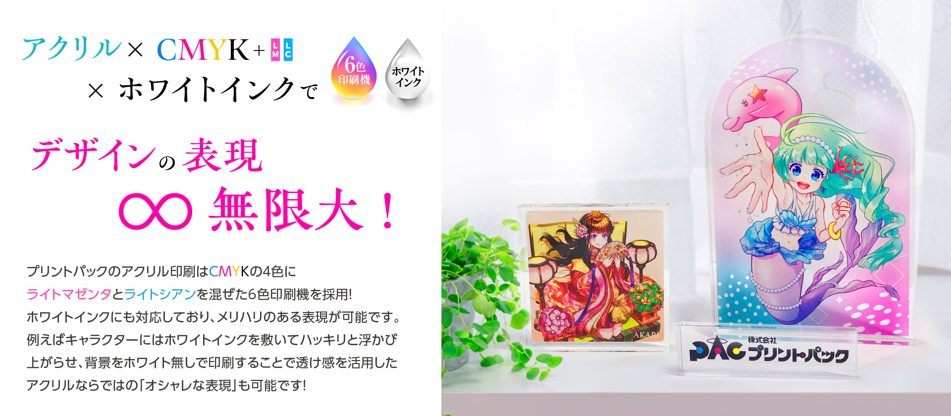 プリントパックのアクリル印刷はCMYKの4色にライトマゼンタとライトシアンを