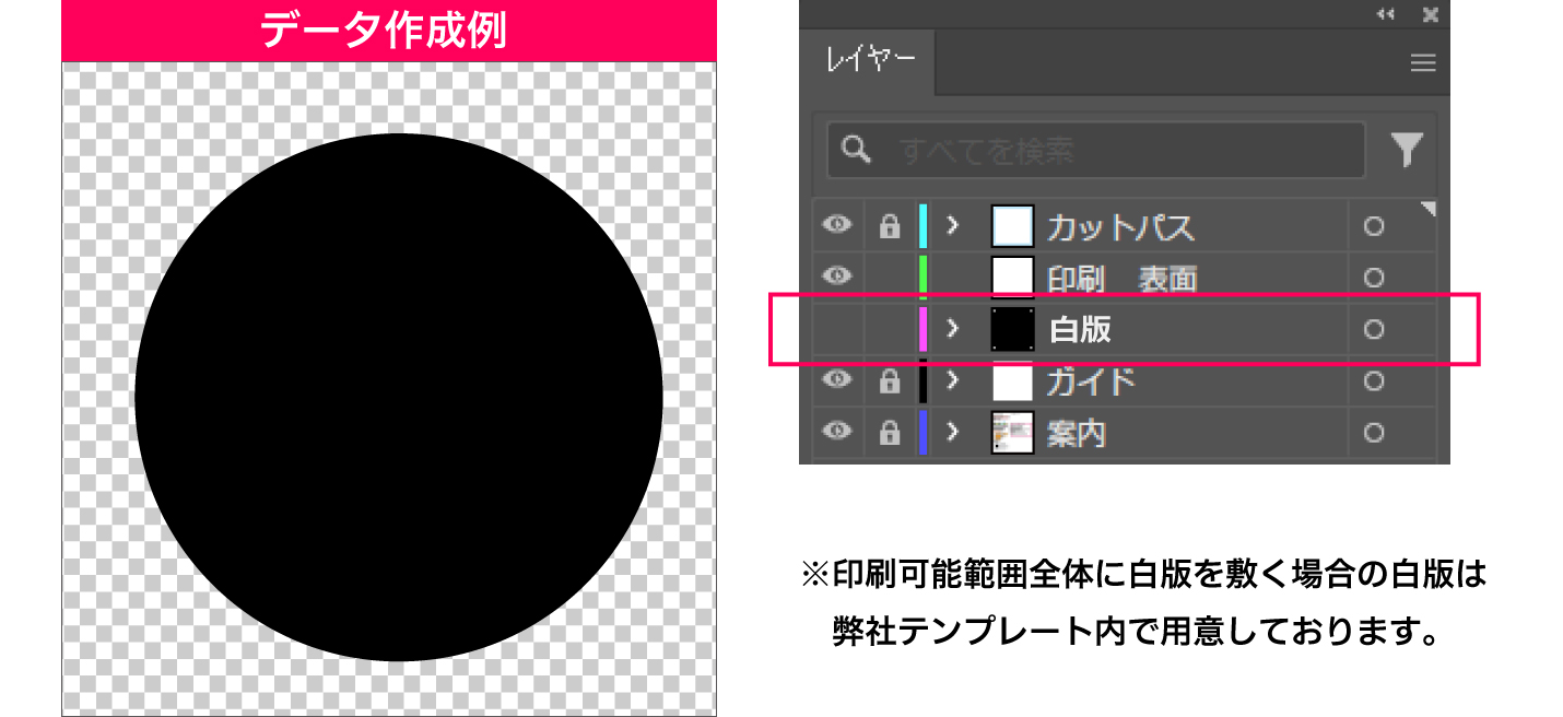 ※白版を敷くことで表面デザインの発色が良くなります。また、両面印刷の場合白版を敷くことで、