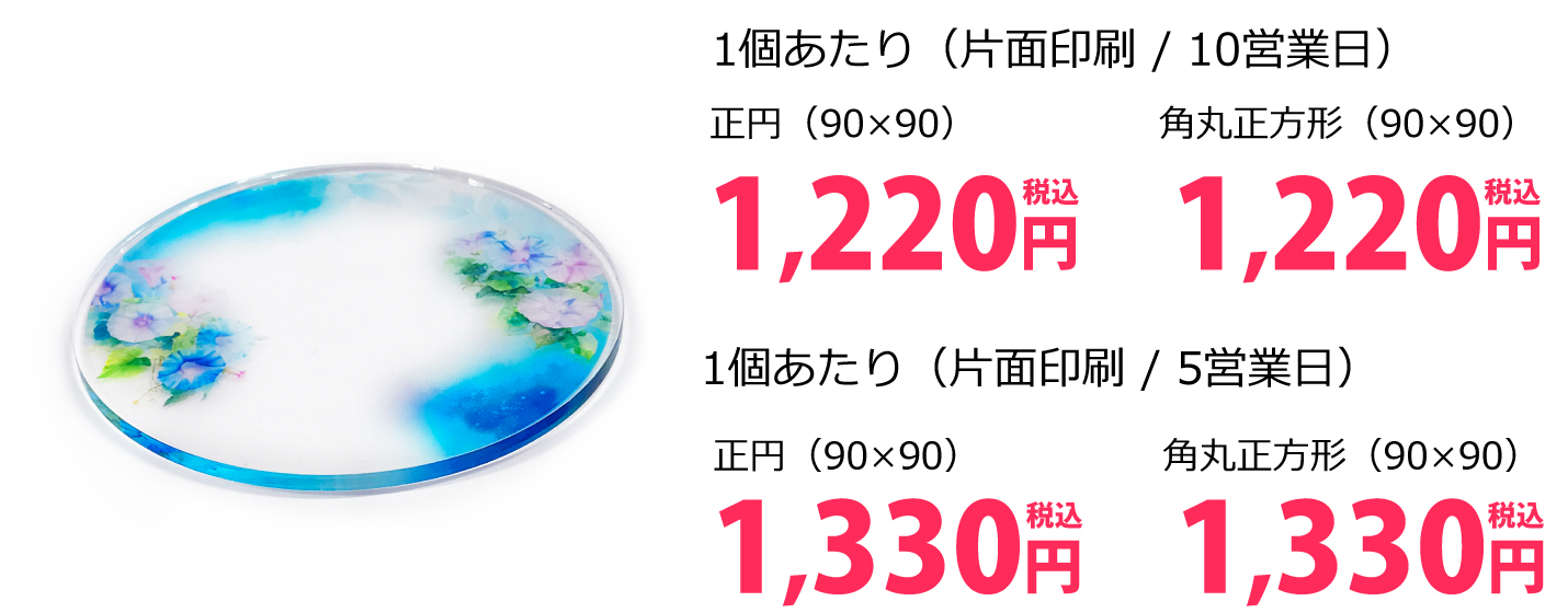 プリントパックのアクリルコースター印刷は、最少1個~1,220円からご注文可能で