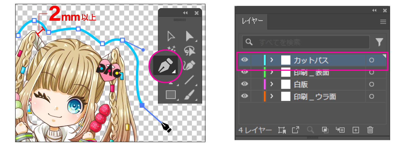 デザインとカットパスの間は必ず2mm以上開けてください。