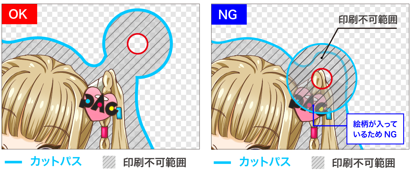 - カットラインとデザインの間は2mm以上離れている