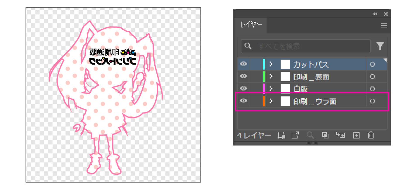 - 裏面デザインの文字やロゴは反転する前提で作成できている