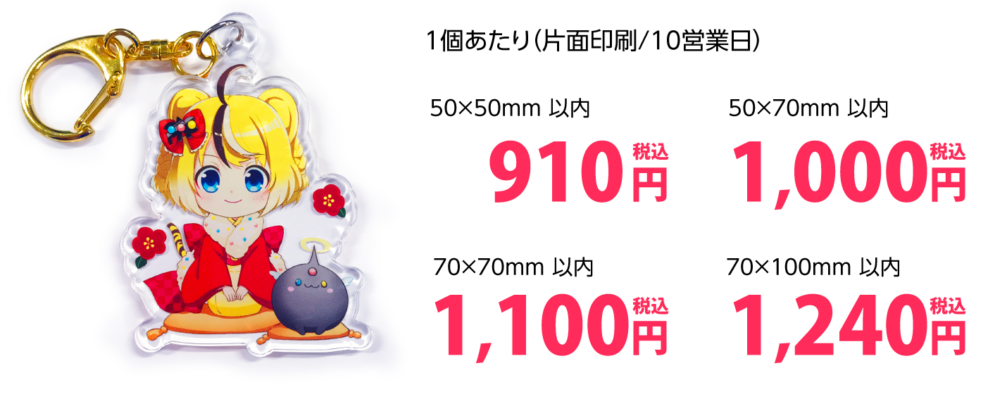 プリントパックのアクリルキーホルダー印刷は、最少1個~910円からご注文可能で
