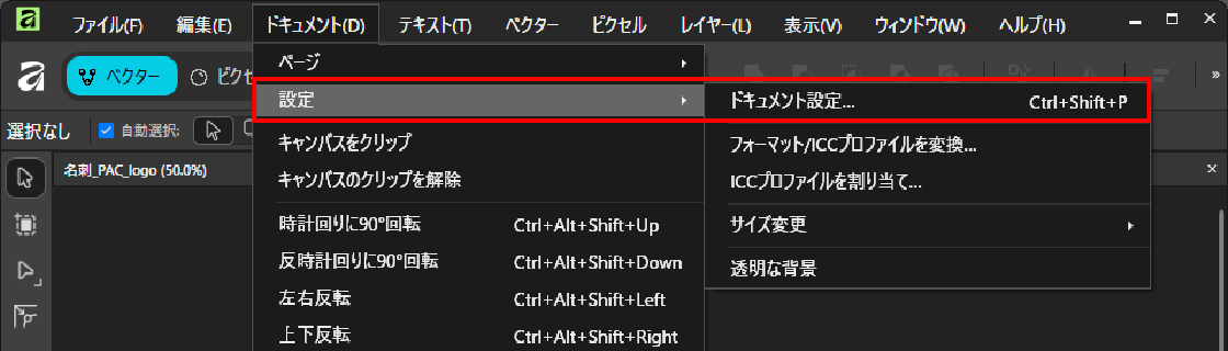 【1】ファイルメニューの【ドキュメント】 ⇒ 【設定】 ⇒ 【ドキュメント設定】を選択