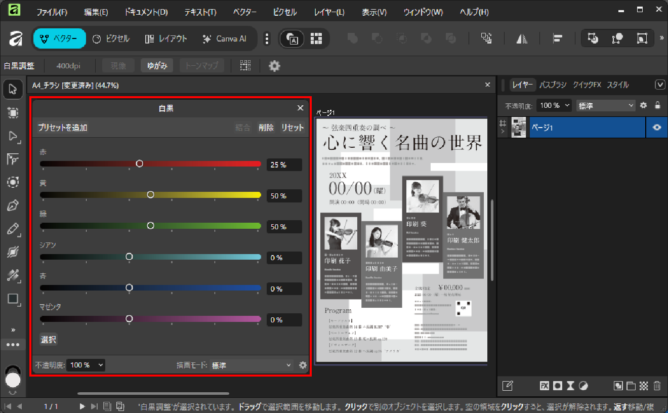 すでに作成されたデザインを一括でグレースケールに変換する方法もございます。