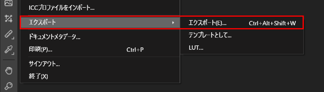 【1】ファイルメニューの【エクスポート】 ⇒ 【エクスポート】または【書き出し】を選択